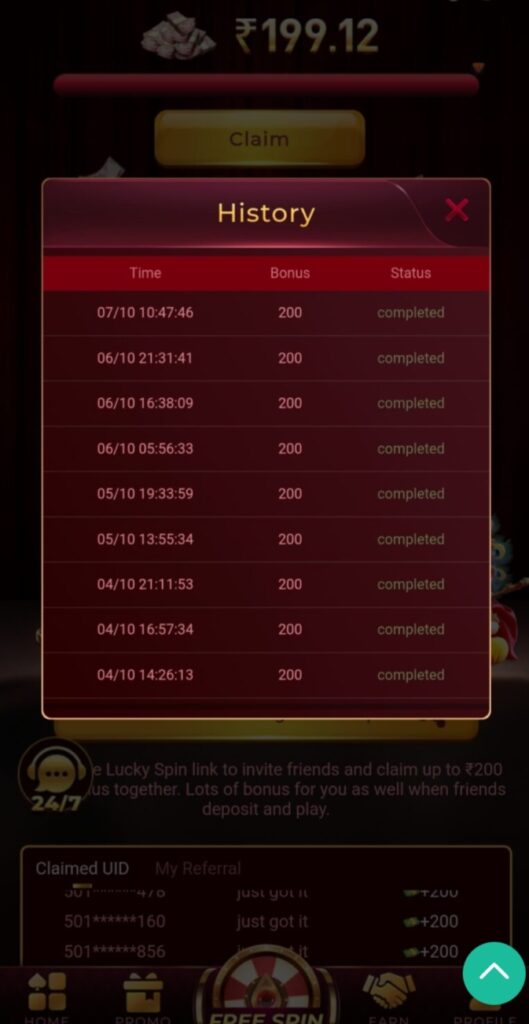 You all can get a lot of free bonuses in this app. And you can get all of them. You can also get a lot of commission in this. You can also get a free spin bonus by spinning in this app. You will get ₹200 as a free spin bonus. The more referrals you all get in a day, the more spin bonus you can get.